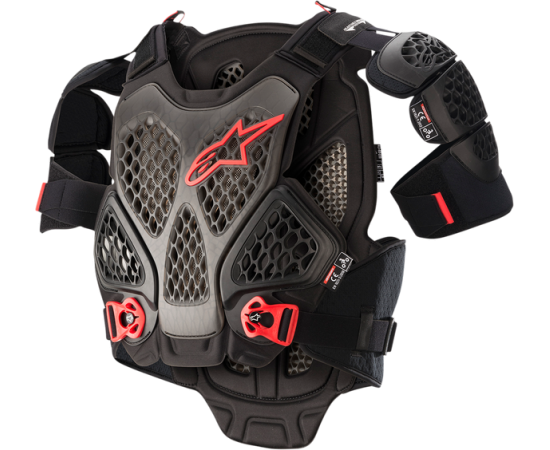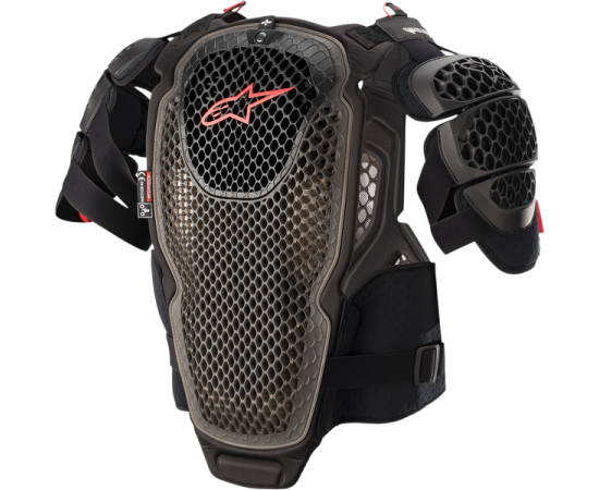 The flexible front side wings are connected to the main chest protector with three bridge fixings allowing the wings to move independently and adapt to the natural contours of the body
