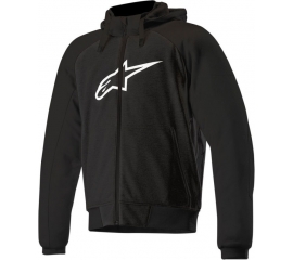 Article Number 4200918-10-S Chrome Sport Hoodie Knitted fabric main shell. Interior aramidic reinforcement on shoulder, elbow and back. One zippered hoodie-style hand pocket on front. High collar with removable storm hood. CE certified BIO LIGHT protectors on shoulders and elbows. Back...