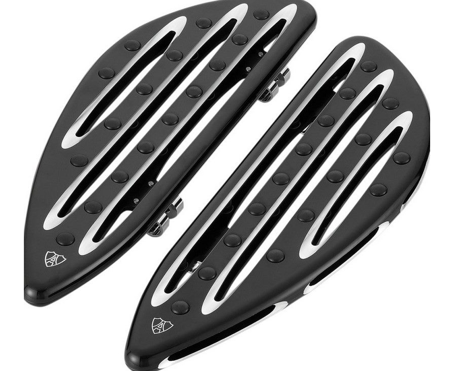 Deep Cut FloorboardsMachined from two pieces of billet aluminum to create a cutting-edge see-through designAdds exceptional style and comfort to your bikeAvailable in chrome or black anodized finish; black anodized features machined accents on the top, bottom and side of the floorboardIncludes all mounting hardwareMatching passenger boards available (sold separately)Driver floorboards: 16" L x 6" W x .75" thick; Passenger floorboards: 7" L x 4" W x 1" thickModels w/ passenger footpegs will require the use of OEM accessory floorboard mounts.