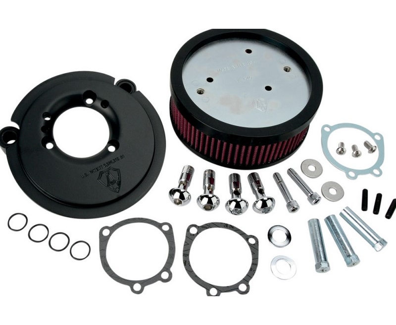 Big Sucker™ Air Filter Kit (Accepts OEM Covers)One-piece aluminum backing plate features patented hidden breather technologyEach hidden breather is o-ringed at the heads and exits at the mouth of the injector/carb to provide efficient engine breathing, eliminating the need for any external hoses or hardwareRadius air inlet provides maximum performance by providing unobstructed airflowStandard red filters are pre-oiled, washable and feature four-layers of surgical grade cotton for optimum filtration and maximum airflowSynthetic filters feature a black synthetic material that is water resistant and never needs to be oiled; just wash and re-useStage I kit accepts OEM outer cover (unless noted) or custom Ness outer coverStage II kit features a 20% larger filter element and accepts an 8" round Ness outer cover onlyAll necessary hardware and instructions are included with each kit