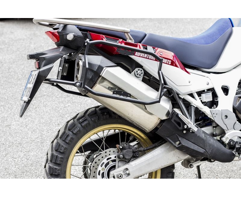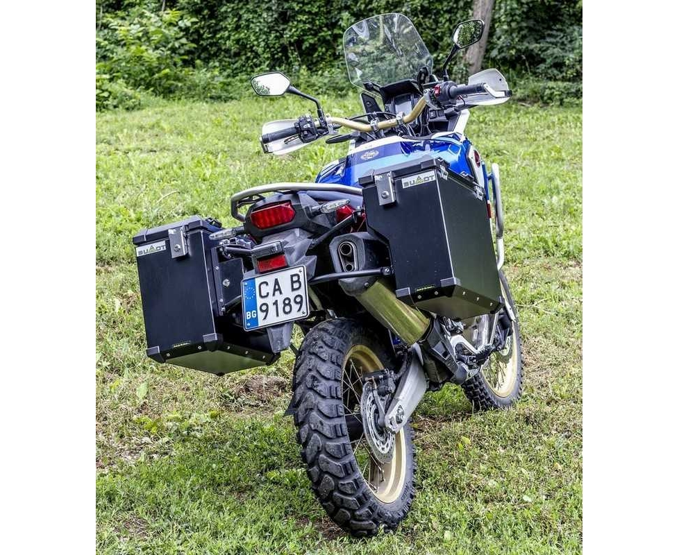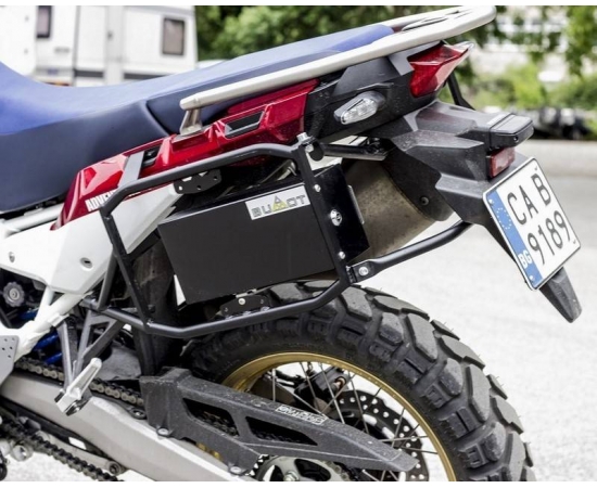 The BUMOT pannier racks make the perfect platform to add BUMOT Defender aluminum panniers or BUMOT Xtremada soft panniers and include all mounting hardware required to install on the bike. The racks are made from mild steel, galvanized for corrosion resistance, and powdercoated black. The optional locking toolbox bolts securely to the pannier racks and is available in your choice of powdercoated Black, Frozen Gray, or Anodizing silver.