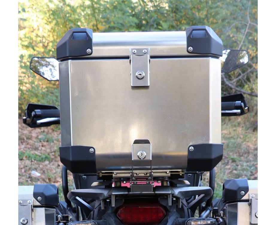Starting wtih 2mm aluminum, BUMOT's unique assembly process employs a technique used in the sports car and airline industry to double the bottom edges and floor of the box from 2mm to 4mm. BUMOT top cases are powdercoated inside and out in your choice of raw aluminum , frozen grey or black, and are finished with zink passivated friction hinges, stainless steel latches with keyed locks, and heavy duty weatherstripping for waterproofnes