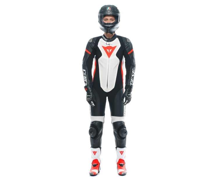 Leather motorcycle suit with localized perforation and dedicated female fit. Extremely protective and comfortable due to the composite protectors and stretch inserts. Suitable for track riding.