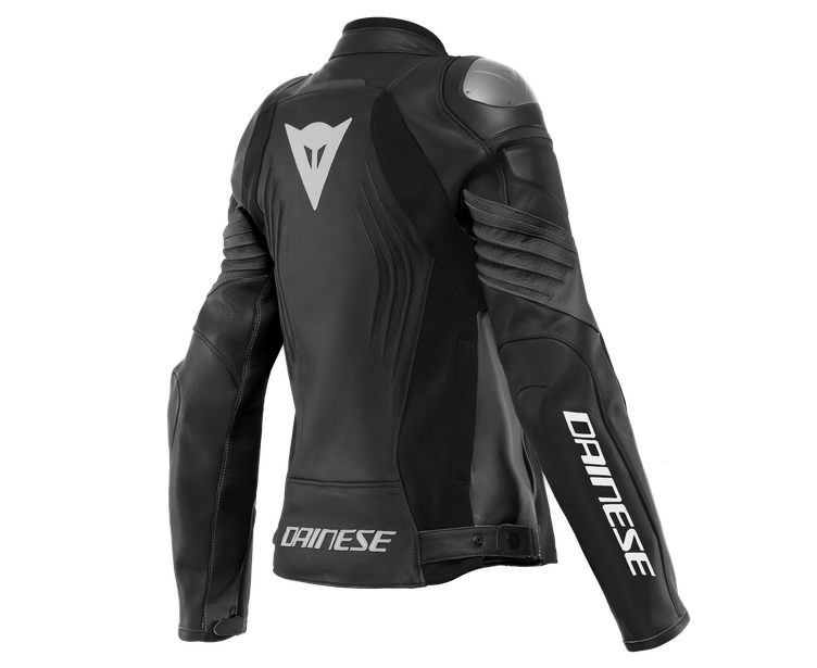 Racing 4 Lady is a women's leather motorcycle jacket designed for the female body to offer extreme comfort and versatility through a series of details, which includes S1 bi-elastic fabric and Microelastic 2.0 leather applied to a premium Tutu cowhide structure. Additional features include an adjustable waist and collar, and the option to connect the jacket to motorcycle pants using the zipper fastening at the hem. The versatility of this leather motorcycle jacket also derives from the ability to achieve optimal temperature control using the two air vents positioned on the chest and two extractors on the sides, which work in synergy with the breathable lining. Maximum safety is guaranteed by EN 1621.1-certified composite protectors at the elbows and shoulders, which are further enhanced by interchangeable external aluminum plates – a distinctive Dainese technology – designed to support and facilitate sliding in case of a fall, thus avoiding the dangerous risks of rolling on asphalt. Back protectors can be added to the Racing 4 Lady using the special pockets. The Racing 4 Lady women's motorcycle jacket is also equipped with two external and two internal pockets to store small items in complete safety.