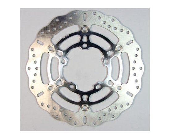 The EBC Brakes® universal custom disc for naked bikes is constructed using a stainless steel rotor blade with a polished and heat lacquered alloy centre hub. Each disc can be used for either left or right fitment and the quality mirror-like polished finish will improve the look of your bike instantly. The slotted and contoured profile gives reduced weight without compromising performance and also gives improved pad brake-in and reduces disc damage. The outer ring is mounted to the centre hub using EBC Brakes® patented SD-System™ square drive hardware. The SD-System™ buttons have flat sides and are mounted into square pockets in the hub and the ring. This system allows the ring to expand and contract when needed under heavy braking which eliminates brake vibration and disc distortion. Do not attempt to polish the lacquered centre hub as this will destroy the lacquer coating.