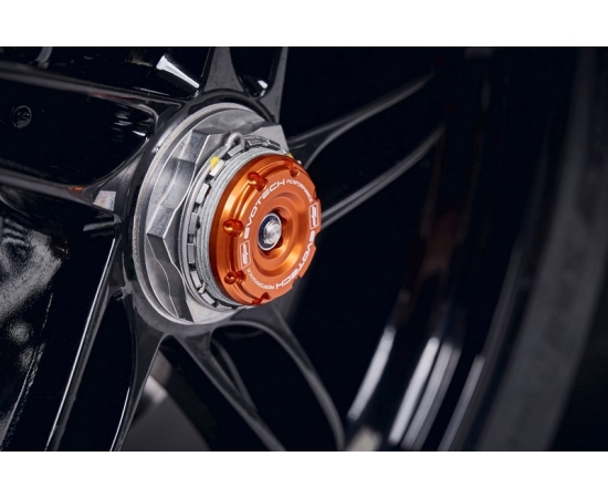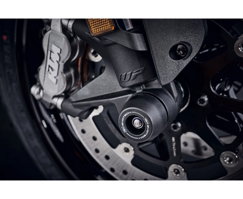 Produced from injection-moulded matt black nylon, EP Front Spindle Bobbins for the KTM 1290 Super Duke GT offer discreet yet strong protection. With the additional support from the aluminium inner, the spindle bobbins aim to be the first to take impact in an incident and hold the expensive front forks, spindle retainers and brake calipers away from harm. The innovative EP design allows the nylon bobbins to rotate above the aluminium to decrease wear and stress on the wheel.