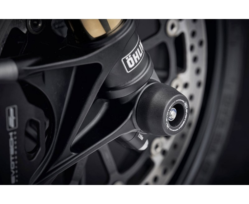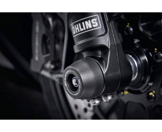 Offering protection to the front wheel spindle, lower front forks and brake calipers, EP spindle bobbins for the Ducati Diavel are discreet yet strong. The black bobbins sit snugly either side of the front spindle, held in place by a rolled-thread spindle rod. The durable materials of injection-moulded nylon and aluminium hope to be first to receive impact should an incident occur. Additionally, the nylon outers are able to twist with impact to reduce stress and wear on the wheel and bobbins.