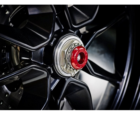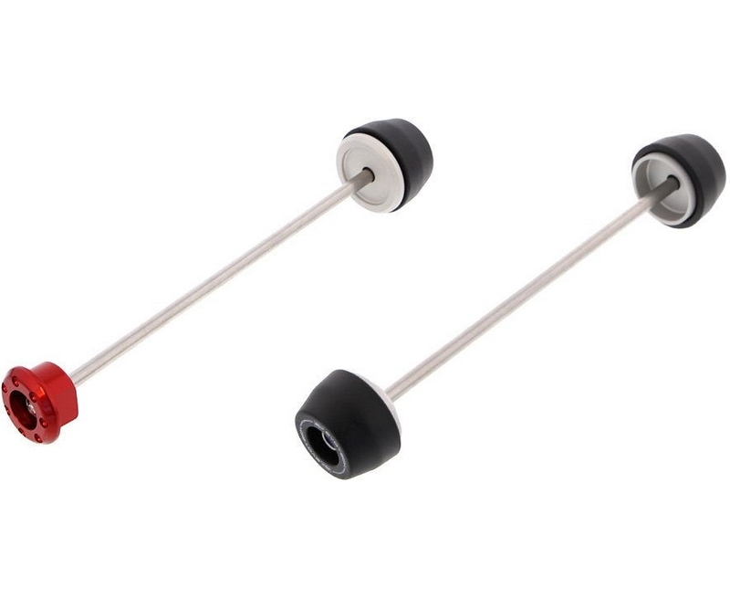 EP Spindle Bobbins for the Ducati Hypermotard 939 offer protection for the expensive swing arm, front forks, brake calipers and sprocket carrier. If the unfortunate occurs, the bobbin should receive impact first. The innovative bobbin design allows the nylon outer to twist above the aluminium core to reduce stress on the wheel. On the exhaust side, an attractive red-anodised hub stop secures the spindle rod in place.