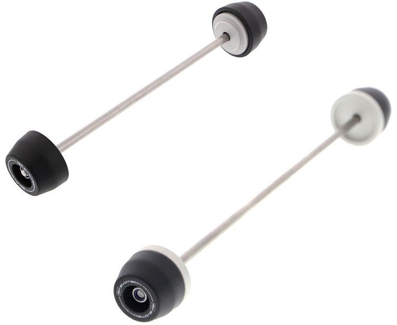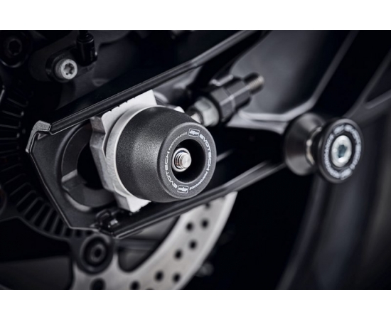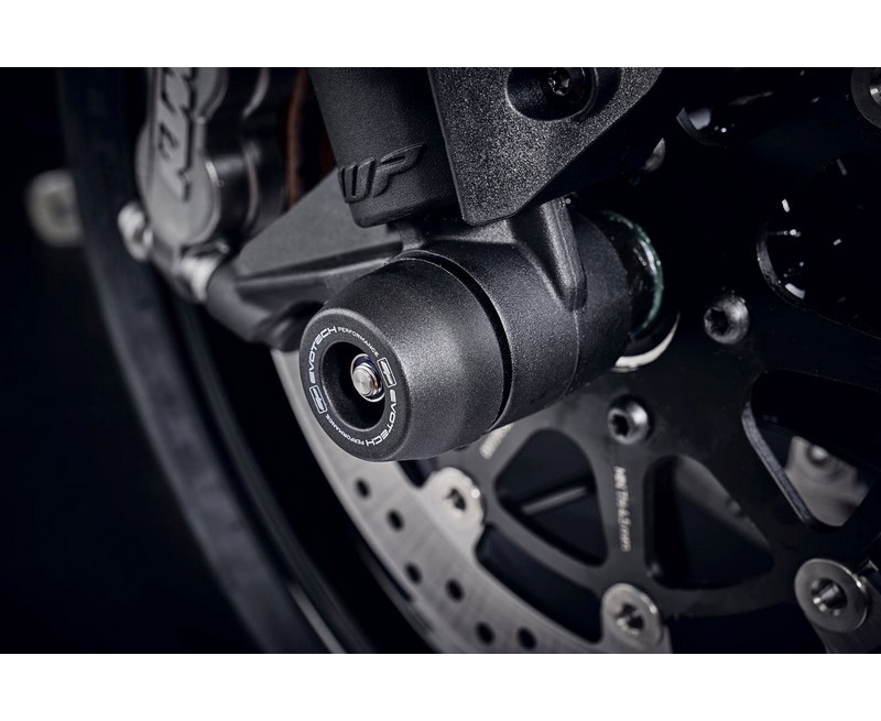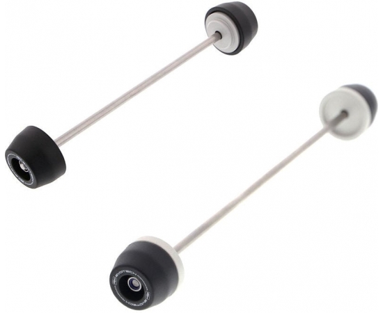 Offering protection to the wheel spindle, lower front forks, brake calipers and swingarm. EP spindle bobbins are discreet yet strong. The black bobbins sit snugly either side of the wheel spindle, held in place by a rolled-thread spindle rod. The durable materials of injection-moulded nylon and aluminium hope to be first to receive impact should an incident occur. Additionally, the nylon outers are able to twist with impact to reduce stress and wear on the wheel and bobbins.