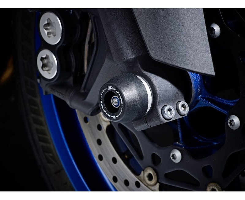 EP Spindle Bobbins for the Yamaha YZF-R6 are designed to guard the front wheel spindle retainers, brake calipers, fork lowers and swingarm. As they stand out from either side of the wheel, the bobbin heads are expected to take impact first in an incident with the dual materials offering durability and strength. Furthermore, the nylon bobbin heads are able to spin above the aluminium inner to reduce stress on the wheel.