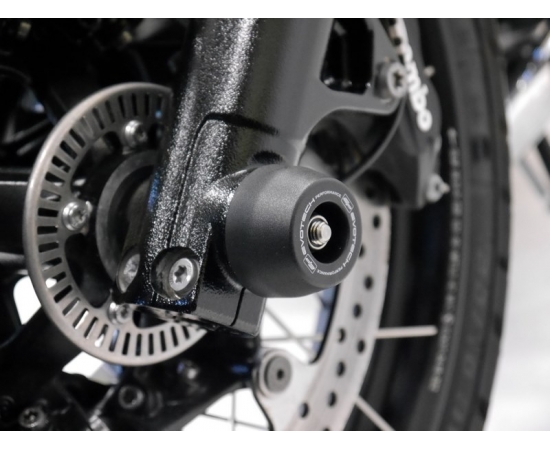 EP’s innovative design brings protection to the front wheel and lower forks of the R nineT Scrambler with Front Spindle Bobbins. A durable nylon bobbin sits on top of an aluminium spacer on either side of your front wheel. These are held in place by a stainless steel spindle rod. The nylon slider and aluminium inner should receive any unexpected impact before the machine. The nylon header is designed to rotate on impact to decrease tension and stress on your motorcycle.