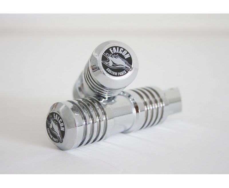 Die FALCON Round Style Soziusfußrasten (Paar) aus hochglanzverchromtem Stahl sind optisch die ideale Ergänzung zur FALCON Round Style Fußrastenanlage.
