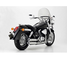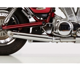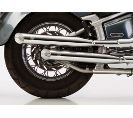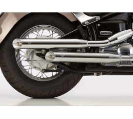 Falcon bietet Auspuffanlagen im ultimativen Chopper-Look: Extra breite, hochglanzpolierte oder mattschwarze Edelstahl-Krümmer mit Endkappen im Groove-Stil sorgen für einen dumpfen und tiefen Choppersound. Neueste Doublewall-Technologie schützt die Schalldämpfer vor Verfärbungen.