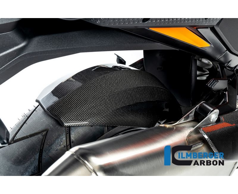 Bolted to the original attachment points, the rear fender made of carbon has proven itself in all situations. It protects the rider and motorcycle much better from the dirt coming from the rear wheel. The exposed chain guard was also lengthened in its construction compared to the original part. This means that unwanted stains - by a well-lubricated chain - on bike and rider are a thing of the past.