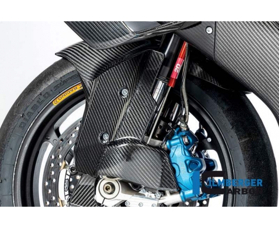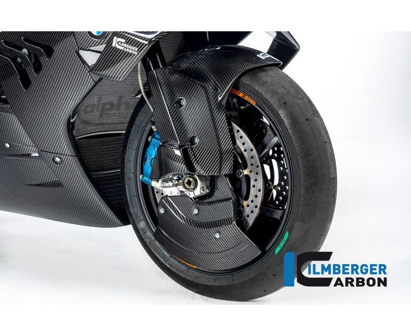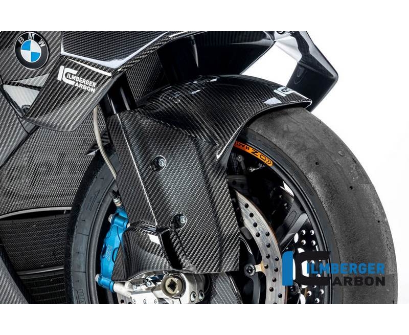 The fender of the M1000RR is much more than just a fender. It elegantly combines the function of previously three components in a single one. The integrated air ducts constantly supply fresh air to the brake calipers while riding to reduce the risk of brake fade. Tested under the toughest conditions, it helps achieve success in the world's most diverse racing series. It already helped the Tecmas Stock Team to a commanding victory at the legendary 24h of LeMans. But the fender cuts a fine figure not only on the race track, but also on the road. But so that not only the new M models benefit from the additional cooling, we looked for a way to make the fender compatible with other models, too. The ABE therefore covers not only the new BMW M1000RR, but all current four-cylinders of BMW. To benefit even more from the aerodynamic advancements on the front wheel, the rear flap prepares the additional mounting of the wheel covers.Through the long continuation of the side surfaces to the rear, not only the air resistance is reduced when driving, but also the sensitive lower fork tubes for the first time reliably protected from stone chips.In order to obtain a harmonious overall picture, the fiber layers are inserted and aligned in the mold by experts. The carbon part fits perfectly into the surrounding shapes of the motorcycle. The more of our parts are installed and combined, the more overwhelming the result.For our carbon we only use prepreg fabric specially produced for this purpose, which is also used in a similar form in Formula 1 and space travel. The material, which is elaborately hand-laminated and cured in several stages in the autoclave, not only impresses with its unique appearance but also with its unique technical properties. With the same volume, it has a specific stiffness three times as high as steel and at the same time, due to its particularly low density, only a fraction of its weight.In order to optimally protect this high-quality material from all kinds of environmental influences, we are the only carbon manufacturer worldwide to use a specially developed plastic coating on all surfaces. In combination with our clear varnish. This ensures a previously unattainable and unique depth effect, which allows the high quality of the material to come into its own.So that not only driving but also screwing is a pleasure, we only use the original fastening points for this part.The facts- racing part, not for street use- improved cooling capacity for the brake- better protection of the lower fork tubes- Sealing of all surfaces (inside and outside) with a unique coating to protect against environmental influences of all kinds- Delivery ready for installation- made of prepreg material specially produced for Ilmberger- Manufactured in-house according to ISO 9001- Attachment using the original attachment points- quick and easy assembly