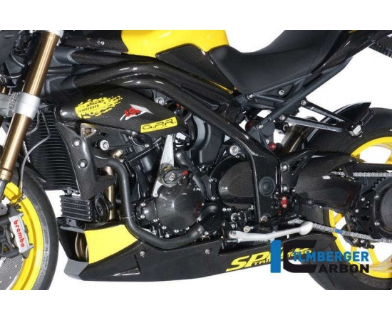 The framecover in carbon for the Triumph Speed Triple is an addition to the original components on the motorcycle and helps to protect the motorcycle. The parts are eighter mounted on original fastening points or glued on the surface with specially delivered glue-strips. Like all of our carbon fibre parts, it was made according to the latest protocols and industry standards and can be considered to encompass all aspects of current 'best of industry' practice. The part is made completely out of pre-preg carbon fibre materials using an autoclave. As with all our carbon parts, we use a clear plastic coating that not only improves the appearance, but also protects the carbon fibre from scratching and has a unique UV resistance.