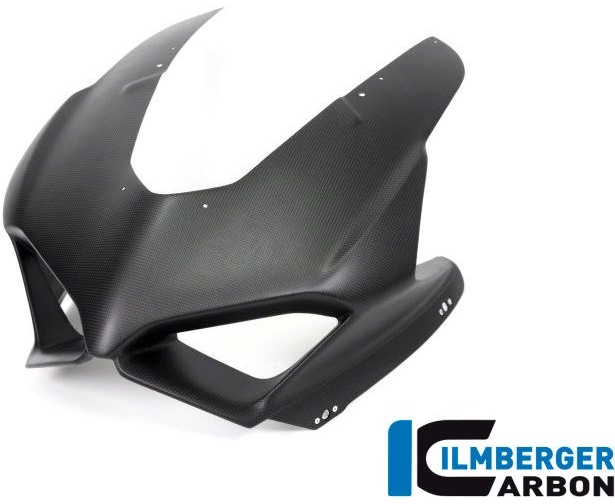 The Superbike version of the front fairing in matt finish for the Ducati V4 / V4 S Racing is equipped with extremely optimized air intakes. This change, compared to the original part, supplies the airbox with as much pressure and fresh air as possible. The matt finish of the surface fits perfectly with the original carbon parts of the Panigale V4 / V4 S Racing.This part is a direct replacement for the original component and contributes mainly to weight saving on the motorcycle (up to 70% less) and a higher stiffness of the parts. Like all of our carbon fibre parts, it was made according to the latest protocols and industry standards and can be considered to encompass all aspects of current 'best of industry' practice. The part is made completely out of pre-preg carbon fibre materials using an autoclave. As with all our carbon parts, we use a clear plastic coating that not only improves the appearance, but also protects the carbon fibre from s