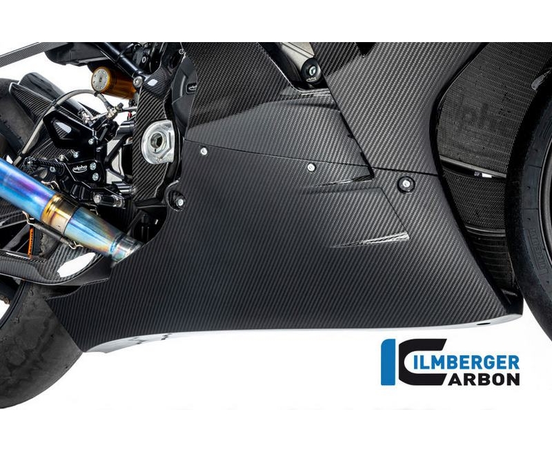 The bellypan of the BMW M1000RR Racing is part of the race fairing kit of the BMW M 1000 RR Racing. It is mounted via quick fasteners and not compatible with the original fairing parts.It is only compatible with a full racing exhaust system. The lower fairing is closed and is suitable to catch up to 5L of fluids. In the front is a hole which can be open when it’s raining.A Carbonfairing is the lightest possible way of producing a fairing and protects the parts underneath on an extraordinary high level. The holes on the side support the hot air stream away from the watercooler.In order to obtain a harmonious overall picture, the fiber layers are inserted and aligned in the mold by experts. The carbon part fits perfectly into the surrounding shapes of the motorcycle. The more of our parts are installed and combined, the more overwhelming the result.For our carbon we only use prepreg fabric specially produced for this purpose, which is also used in a similar form in Formula 1 and space travel. The material, which is elaborately hand-laminated and cured in several stages in the autoclave, not only impresses with its unique appearance but also with its unique technical properties. With the same volume, it has a specific stiffness three times as high as steel and at the same time, due to its particularly low density, only a fraction of its weight.In order to optimally protect this high-quality material from all kinds of environmental influences, we are the only carbon manufacturer worldwide to use a specially developed plastic coating on all surfaces. In combination with our clear varnish. This ensures a previously unattainable and unique depth effect, which allows the high quality of the material to come into its own.So that not only driving but also screwing is a pleasure, we only use the original fastening points for this part.The facts- racing part, not for street use- improved cooling capacity for the brake- better protection of the lower fork tubes- Sealing of all surfaces (inside and outside) with a unique coating to protect against environmental influences of all kinds- Delivery ready for installation- made of prepreg material specially produced for Ilmberger- Manufactured in-house according to ISO 9001- Attachment using the original attachment points- quick and easy assembly