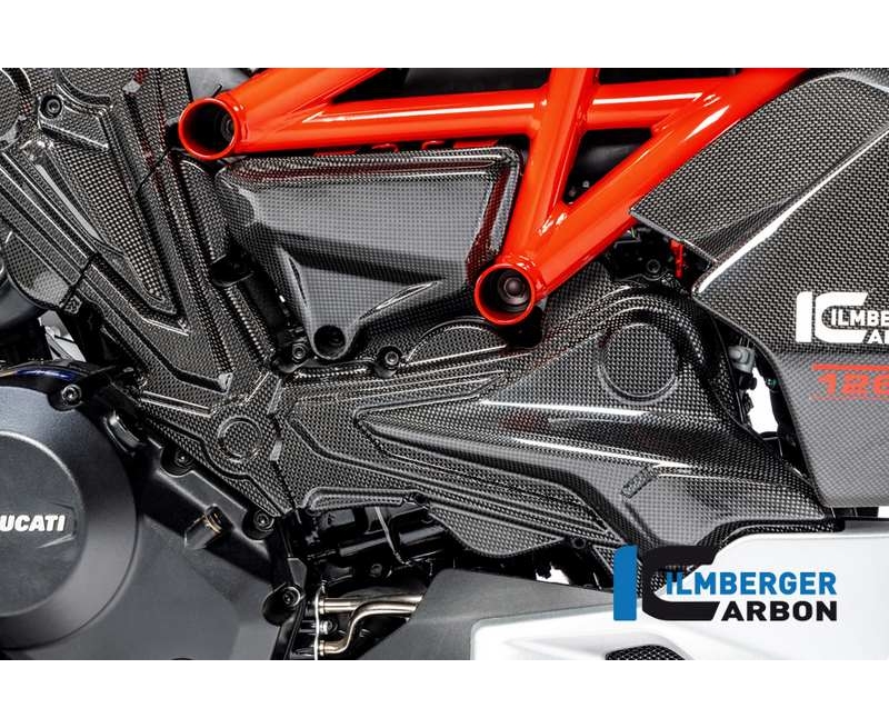 Die Zahnriemenabdeckung für den horizontalen Zylinder aus Carbon und in glänzender Ausführung für die Ducati Diavel 1260 ab 2019 wird an vorhandenen Haltepunkten am Fahrzeug aufgeschraubt.