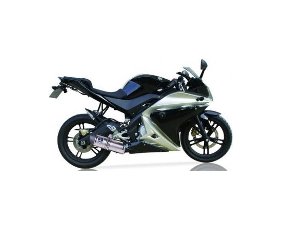 Silencer manufactured from AISI304 stainless steel with a satin polished finish.Asymmetric and conical end cap, manufactured in aluminum with high temperature black lacquer.