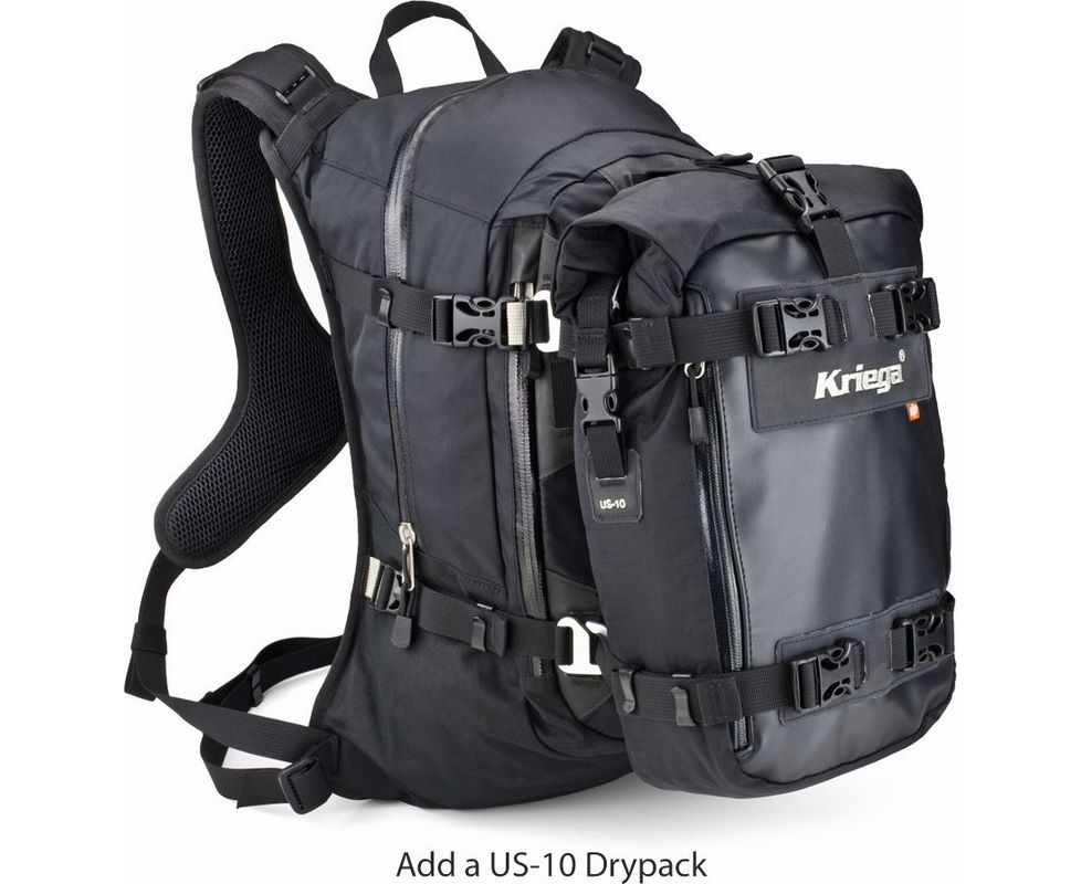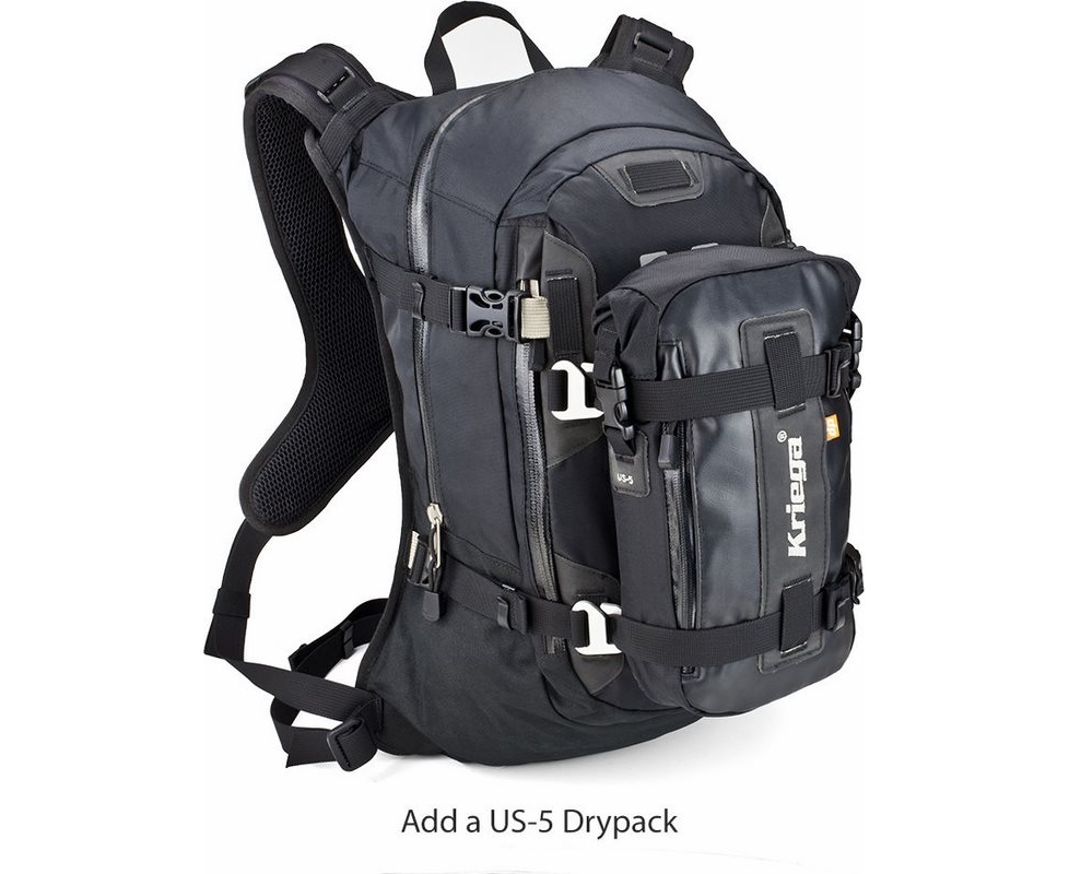 Incorporating Kriega's Quadloc-lite™ system, the harness is angled away from under the arms giving total freedom of movement. Once set, the pack is exceptionally convenient to use with none of the re-adjustment necessary on conventional harness systems.