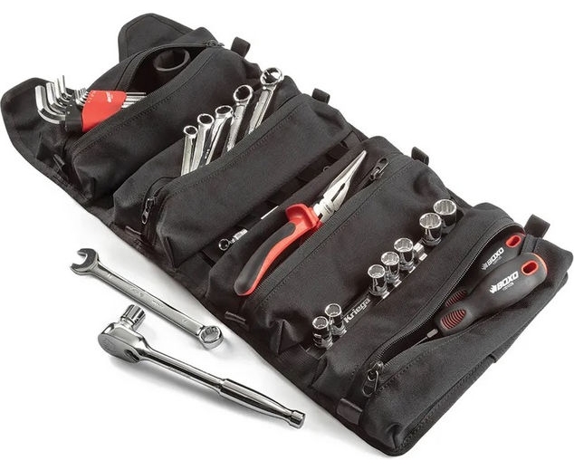 The Roland Sands Design X Kriega Roam Tool Roll is an indispensable piece of kit on any road trip. Store in your luggage or mount to the bike with the Velcro® Molle system, it’s a haven for your tools and spares. Constructed from RSD’s propriety wax cotton together with 1000D Cordura® and super tough hypalon reinforcement, the blend of Classic and Modern materials with a technical twist. Unclip and roll-out to reveal four YKK® zip access pockets, 10 elastic loops and a T6 alloy rail with 8 x 3/8" clips for socket management. Additional 1/4” and 1/2” socket rails can also be added. (sold separately)