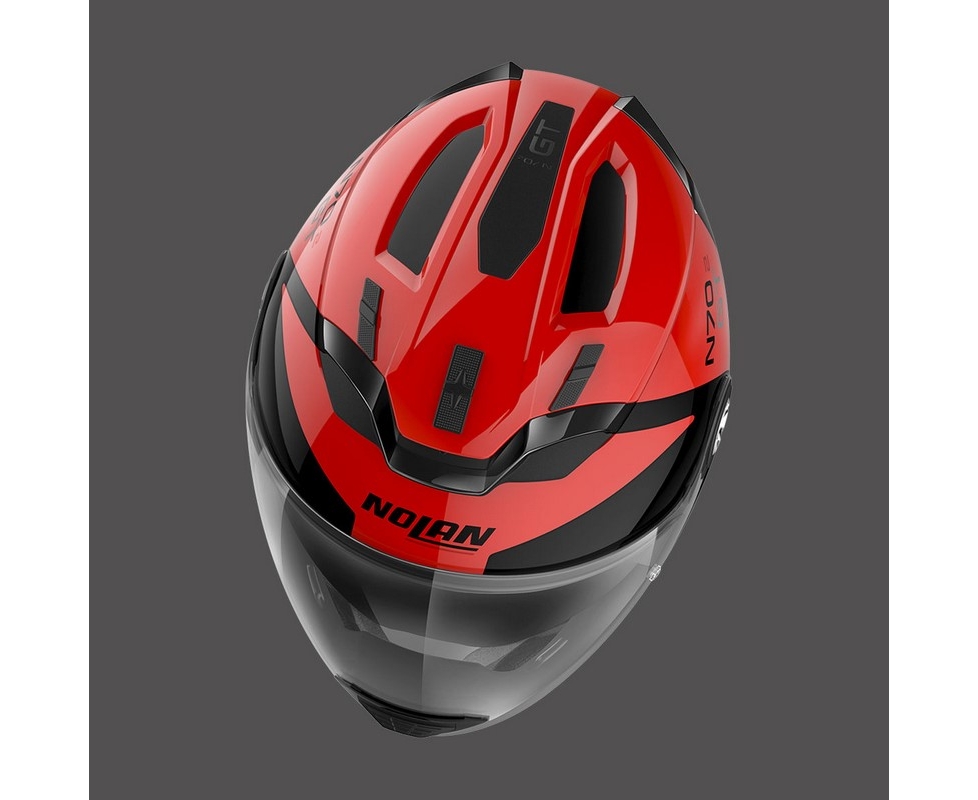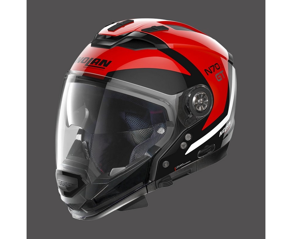 General Information: This is Nolan’s new top-of-the range road crossover which maintains and enriches the much-appreciated characteristics of its predecessor, the N44. It is characterized by an unmistakable design, its many technical features and the ample range of colours and graphics available. Its compact size (thanks to the availability of two outer shell sizes), double P/J homologation, ultrawide visor, VPS sunscreen (adjustable to various positions and fitted with the automatic repositioning system), AirBooster Technology upper ventilation system, double lever Microlock2 retention system with micrometric regulation, innovative Clima Comfort inner padding (with micro-perforated fabric and adjustable neck-roll) and set up for the N-Com communication system make the N70-2 GT the definitive road crossover for the most demanding of motorbike tourists.