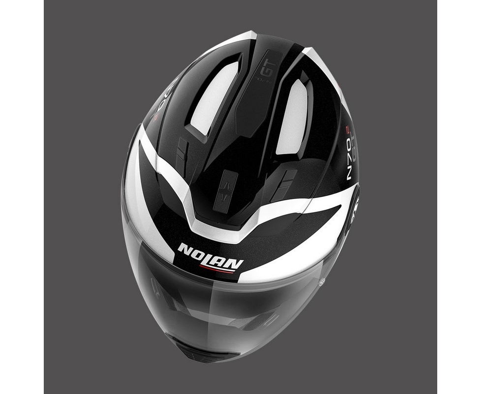 General Information: This is Nolan’s new top-of-the range road crossover which maintains and enriches the much-appreciated characteristics of its predecessor, the N44. It is characterized by an unmistakable design, its many technical features and the ample range of colours and graphics available. Its compact size (thanks to the availability of two outer shell sizes), double P/J homologation, ultrawide visor, VPS sunscreen (adjustable to various positions and fitted with the automatic repositioning system), AirBooster Technology upper ventilation system, double lever Microlock2 retention system with micrometric regulation, innovative Clima Comfort inner padding (with micro-perforated fabric and adjustable neck-roll) and set up for the N-Com communication system make the N70-2 GT the definitive road crossover for the most demanding of motorbike tourists.