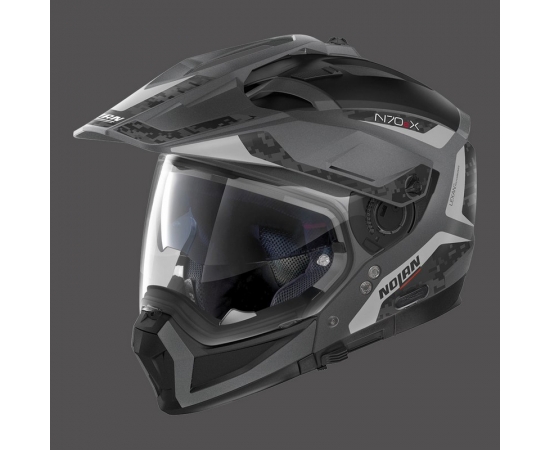 General Information: This is Nolan’s new top-of-the range road and off road crossover, the first on/off road helmet fitted with a removable protective chin guard on the market. It is characterized by an off road-inspired design, its many technical features and the ample range of colours and graphics available. Its compact size (thanks to the availability of two outer shell sizes), double P/J homologation, ultrawide visor, a particularly wide window compatible with mask use (even with the visor fitted and open), VPS sunscreen (adjustable to various positions and fitted with the automatic repositioning system), AirBooster Technology upper ventilation system, double lever Microlock2 retention system with micrometric regulation, innovative Clima Comfort inner padding (with micro-perforated fabric and adjustable neck-roll) and set up for the N-Com communication system make the N70-2 X the definitive on