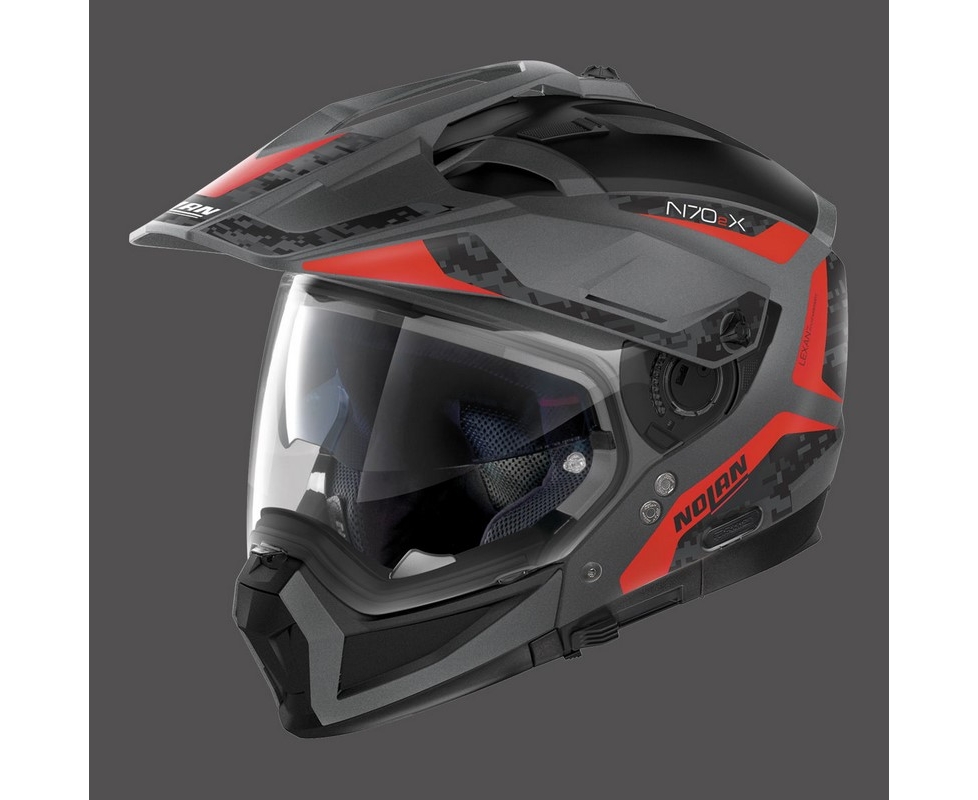 General Information: This is Nolan’s new top-of-the range road and off road crossover, the first on/off road helmet fitted with a removable protective chin guard on the market. It is characterized by an off road-inspired design, its many technical features and the ample range of colours and graphics available. Its compact size (thanks to the availability of two outer shell sizes), double P/J homologation, ultrawide visor, a particularly wide window compatible with mask use (even with the visor fitted and open), VPS sunscreen (adjustable to various positions and fitted with the automatic repositioning system), AirBooster Technology upper ventilation system, double lever Microlock2 retention system with micrometric regulation, innovative Clima Comfort inner padding (with micro-perforated fabric and adjustable neck-roll) and set up for the N-Com communication system make the N70-2 X the definitive on