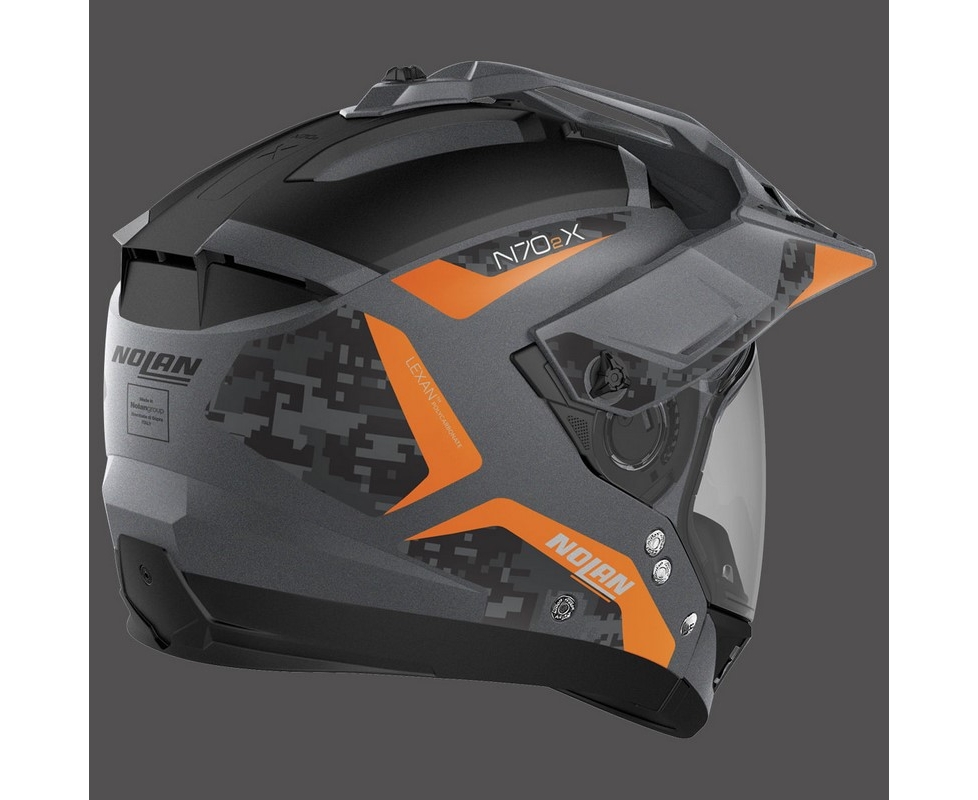 General Information: This is Nolan’s new top-of-the range road and off road crossover, the first on/off road helmet fitted with a removable protective chin guard on the market. It is characterized by an off road-inspired design, its many technical features and the ample range of colours and graphics available. Its compact size (thanks to the availability of two outer shell sizes), double P/J homologation, ultrawide visor, a particularly wide window compatible with mask use (even with the visor fitted and open), VPS sunscreen (adjustable to various positions and fitted with the automatic repositioning system), AirBooster Technology upper ventilation system, double lever Microlock2 retention system with micrometric regulation, innovative Clima Comfort inner padding (with micro-perforated fabric and adjustable neck-roll) and set up for the N-Com communication system make the N70-2 X the definitive on