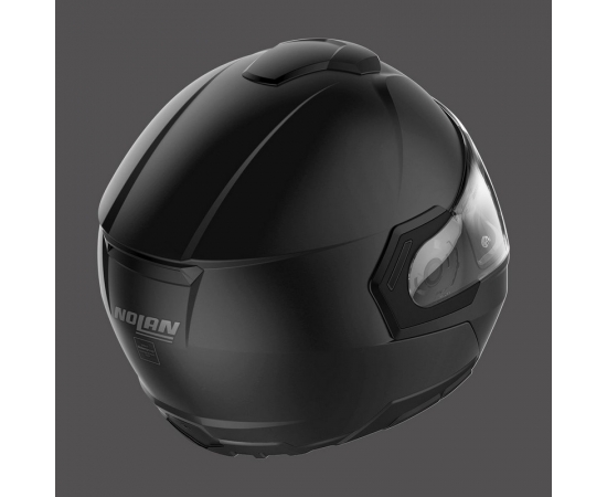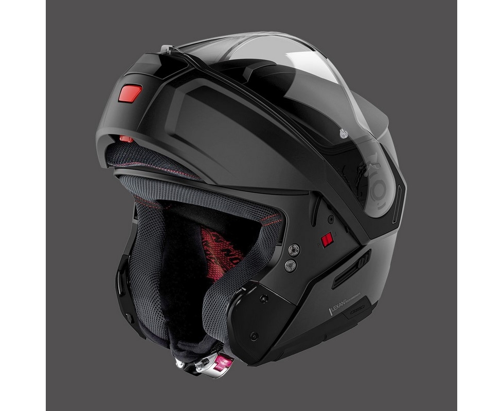 General Information: This is Nolan’s new entry-level flip up helmet. It is characterised by a solid and compact design and its generous technical specifications. Double P/J homologation, ultrawide visor, VPS sunscreen (adjustable in various positions), AirBooster Technology upper ventilation system, exclusive double action chin guard opening mechanism, double lever Microlock2 retention system with micrometric adjustment and set-up for the N-Com communication system make the N90-3 an interesting flip up helmet for both the scooter and motorbike sectors.