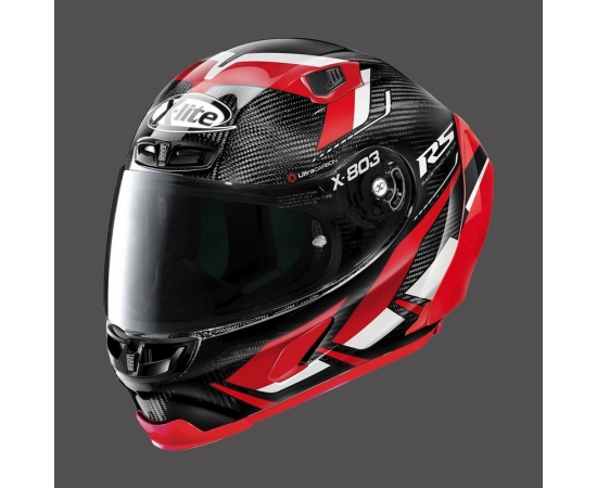 -Nolan Emergency Release System), reliable visor mechanism with a Double Action system, efficient RAF (Racing Air Flow) ventilation system and Carbon Fitting Racing Experience inner comfort padding (with an innovative net Construction). The X-803 RS ULTRA CARBON is presented as the most exclusive racing full face helmet for motorcyclists who want to enjoy their experience on the racetrack to the full.