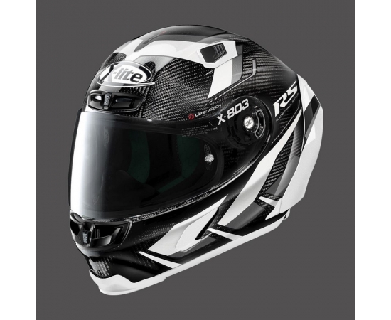 -Nolan Emergency Release System), reliable visor mechanism with a Double Action system, efficient RAF (Racing Air Flow) ventilation system and Carbon Fitting Racing Experience inner comfort padding (with an innovative net Construction). The X-803 RS ULTRA CARBON is presented as the most exclusive racing full face helmet for motorcyclists who want to enjoy their experience on the racetrack to the full.