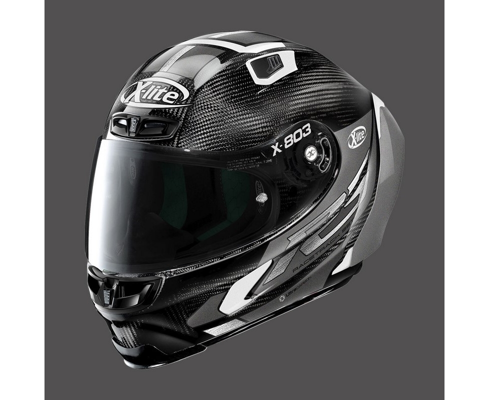 -Nolan Emergency Release System), reliable visor mechanism with a Double Action system, efficient RAF (Racing Air Flow) ventilation system and Carbon Fitting Racing Experience inner comfort padding (with an innovative net Construction). The X-803 RS ULTRA CARBON is presented as the most exclusive racing full face helmet for motorcyclists who want to enjoy their experience on the racetrack to the full.