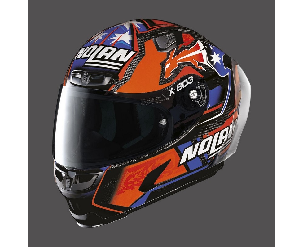 -Nolan Emergency Release System), reliable visor mechanism with a Double Action system, efficient RAF (Racing Air Flow) ventilation system and Carbon Fitting Racing Experience inner comfort padding (with an innovative net Construction). The X-803 RS ULTRA CARBON is presented as the most exclusive racing full face helmet for motorcyclists who want to enjoy their experience on the racetrack to the full.