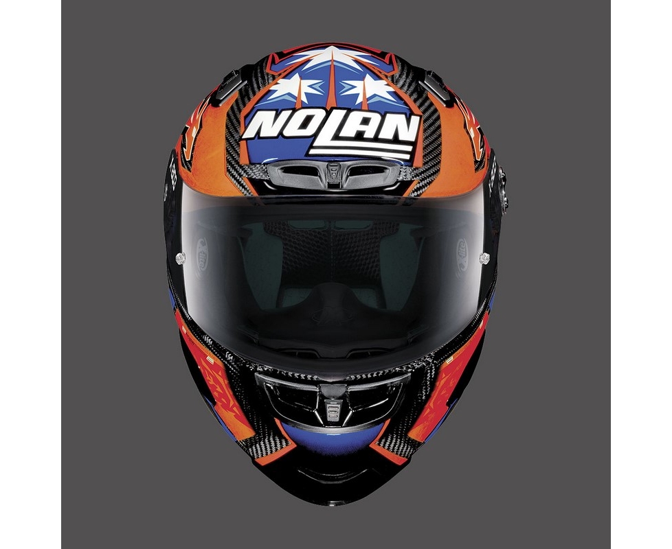-Nolan Emergency Release System), reliable visor mechanism with a Double Action system, efficient RAF (Racing Air Flow) ventilation system and Carbon Fitting Racing Experience inner comfort padding (with an innovative net Construction). The X-803 RS ULTRA CARBON is presented as the most exclusive racing full face helmet for motorcyclists who want to enjoy their experience on the racetrack to the full.