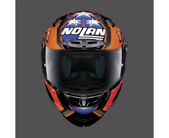 -Nolan Emergency Release System), reliable visor mechanism with a Double Action system, efficient RAF (Racing Air Flow) ventilation system and Carbon Fitting Racing Experience inner comfort padding (with an innovative net Construction). The X-803 RS ULTRA CARBON is presented as the most exclusive racing full face helmet for motorcyclists who want to enjoy their experience on the racetrack to the full.