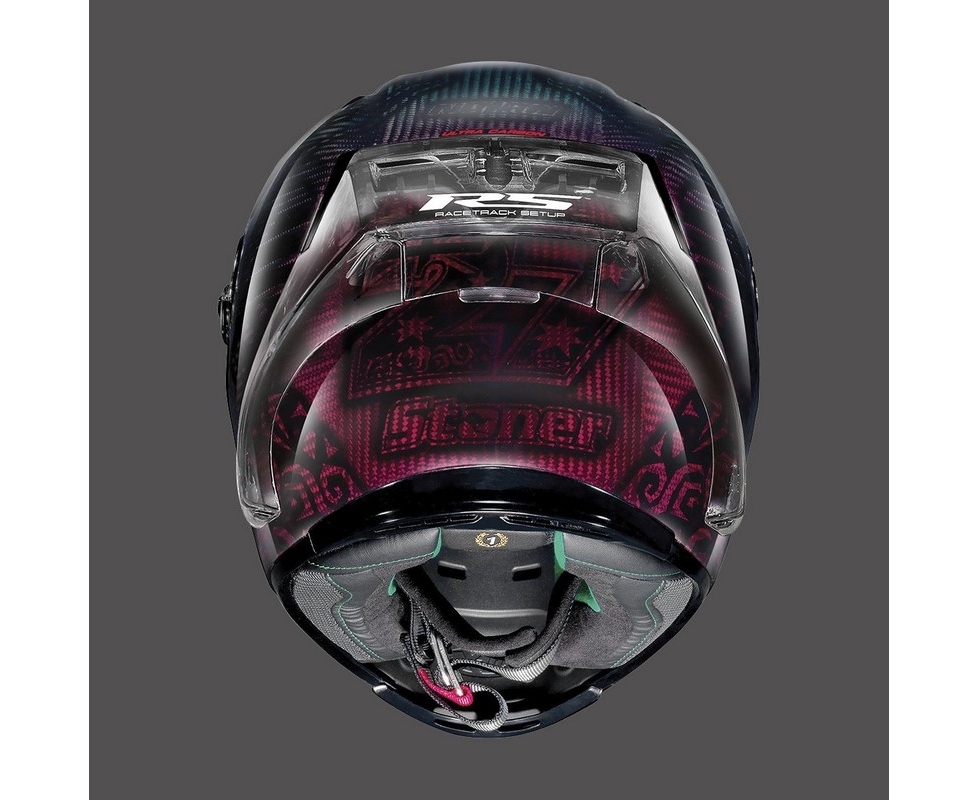 General Information: This is the new version of the racing full face high-carbon-content helmet by X-lite, here enhanced by an exclusive Racetrack Setup (RS). This is composed of an additional Dark Green visor in the box, the Racetrack Aerodynamic Spoiler (RAS), and an exclusive adjustment system for the position of the Liner (LPC