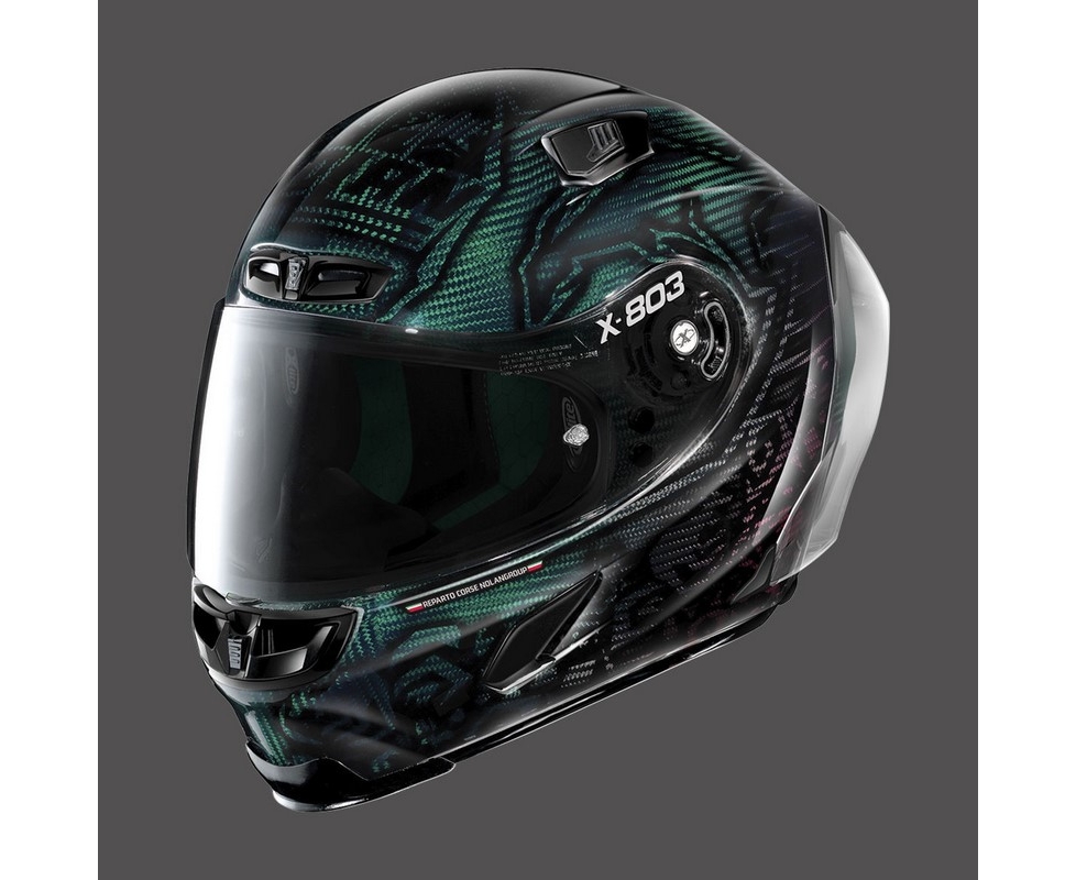 -Nolan Emergency Release System), reliable visor mechanism with a Double Action system, efficient RAF (Racing Air Flow) ventilation system and Carbon Fitting Racing Experience inner comfort padding (with an innovative net Construction). The X-803 RS ULTRA CARBON is presented as the most exclusive racing full face helmet for motorcyclists who want to enjoy their experience on the racetrack to the full.
