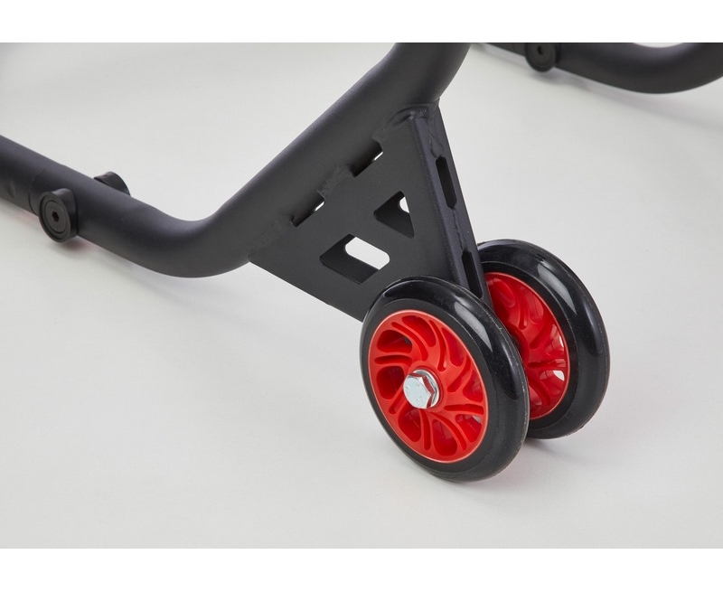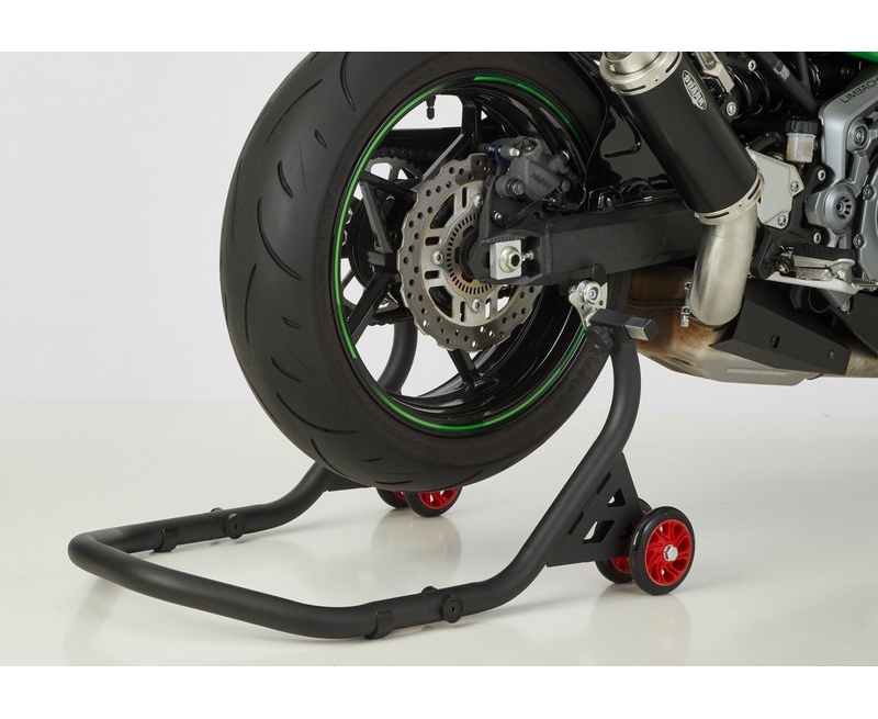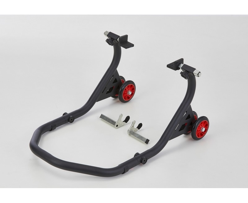 Der PROTECH Universal Montageständer hinten ermöglicht sicheres und einfaches Aufbocken des Hinterrads und passt für fast alle Motorräder mit zugänglicher Zweiarmschwinge. Die Breite der Aufnahmen ist mit Rändelschrauben individuell über einen weiten Bereich einstellbar. Je nach Motorrad erfolgt das Aufbocken über gummierte Aufnahmewinkel, die unter Schwinge positioniert werden, oder das Einhängen von Racingadaptern in die V-Aufnahme des Montageständers (Lieferung inklusive Winkel- und V-Aufnahme). Sind noch keine Adapterrollen (Bobbins) montiert, werden diese zusätzlich benötigt und sind als Zubehör erhältlich. Die großen Doppelrollen bieten Stabilität beim Auf- und Abbocken. Absolut platzsparend dank Zerle