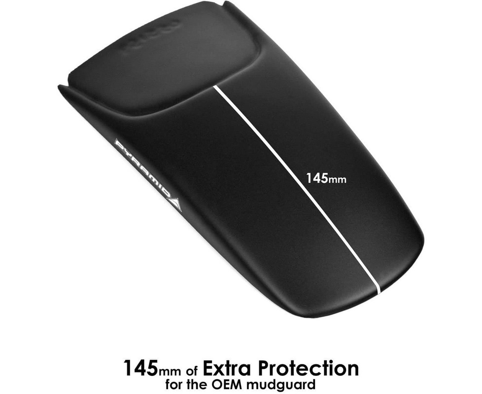 - Click here for fitting instructionsManufactured from ABSAdding an extension to your OEM Front Guard. Please note this will not fit with the Carbon Front GuardThe Pyramid front mudguard extension the Extenda Fenda is one of our trademark products which we manufacture from high quality ABS. The Extenda Fenda offers a durable and long-lasting extension to your front mudguard. This product will help keep your exhaust headers and lower engine free from dirt as well as protecting your expensive radiator from stone damage. Specifically designed to follow the contour of your motorcycle's front guard our Extenda Fenda is supplied with both plastic rivets for mechanical fitment and a sheet of our specially sourced 'Stick Fit Pads' for those customers who would prefer not to drill their front mudguard. Our Extenda Fenda is simple to install and will arrive safely packaged together with comprehensive fitting instructions and all necessary fittings as detailed above.
