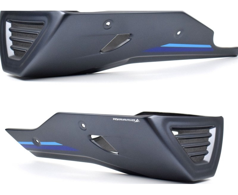 Pyramid Belly Pans are one of our trade mark products. Designed specifically for your motorcycle and incorporating styling to accentuate the contours of your existing bodywork our Belly Pans also offer added protection to your exhaust downpipes and lower engine.Available in a range of colour schemes this product will arrive carefully packaged together with a full fitting kit comprehensive fitting instructions and any bracketry which may be required. No modification to your motorcycle is necessary.We always advise the use of our Venture Shield protection film to minimise the effects of stone chips and cracking during use especially on painted products which sit low to the ground. Without Venture Shield fitted to these low forward facing parts of your bodywork then unfortunately damage from stones and other debris is unavoidable!