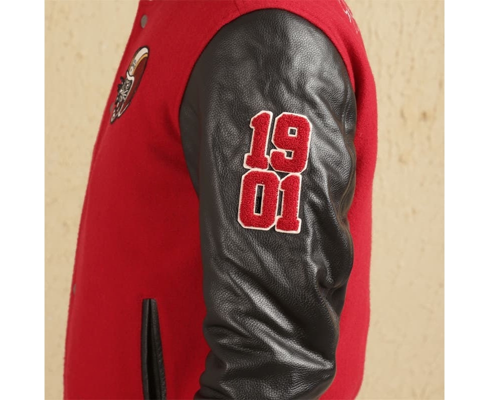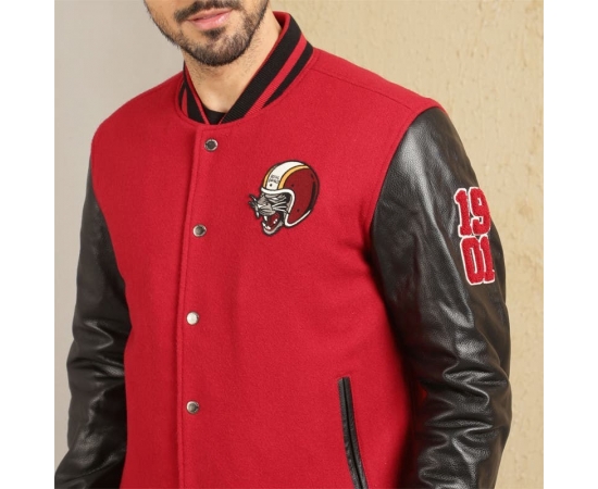 This motorcycling-inspired Varsity Jacket pays homage to the Black Cat Commandos with the panther mascot badge embroidered on the chest. Built with wool blend and leather, the lightweight wadding in the inside lining keeps you warm and snug. The iconic pinstripe rib detail on the collar and cuff gives a sporty look.