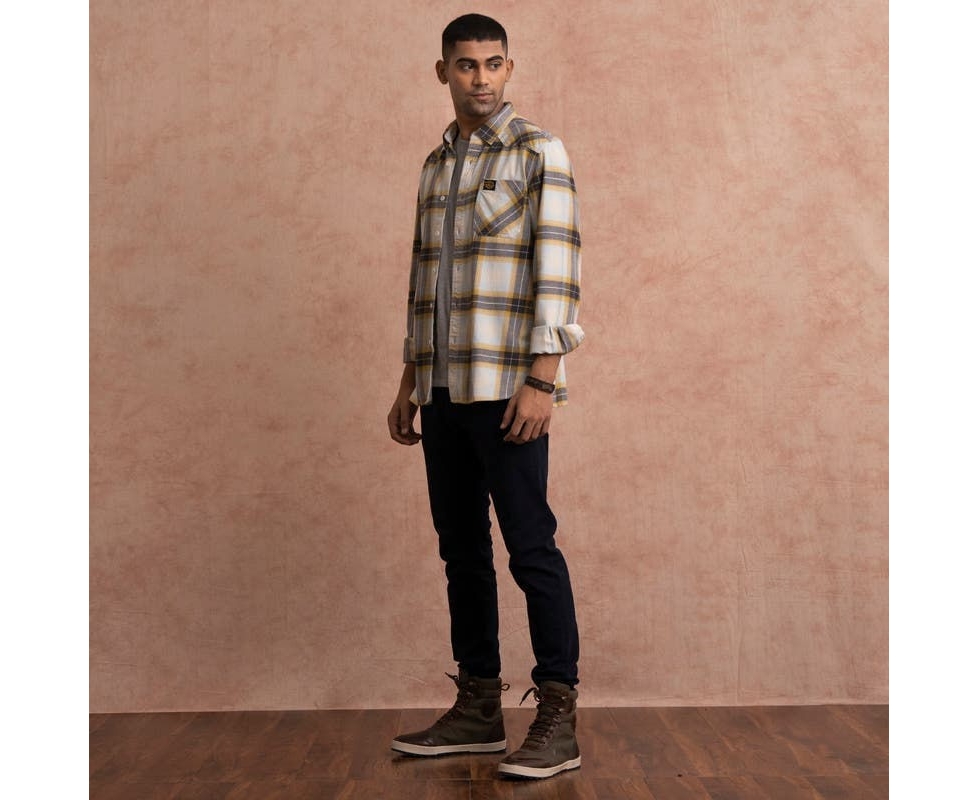 Ride in style with the Royal Enfield Heavy Weight Flannel Shirt. The shirt features light grey checks on a pure cotton twill fabric. It has a patch pocket on the front with the Royal Enfield logo. In addition, the shirt has a button-down collar and shaped yolk to provide movement space.