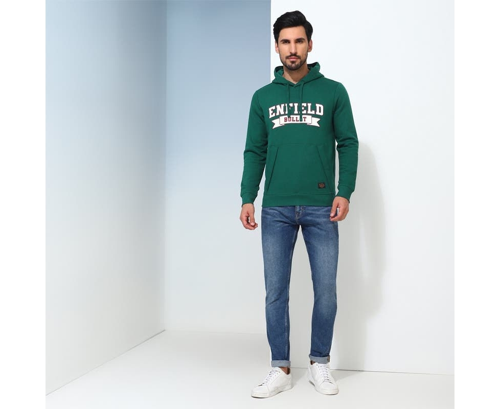 Embrace casual elegance with the Royal Varsity Hoodie. This cotton-poly hoodie was engineered keeping your comfort in mind and showcases the iconic Enfield Bullet print on the chest, giving it a sporty, varsity aesthetic.