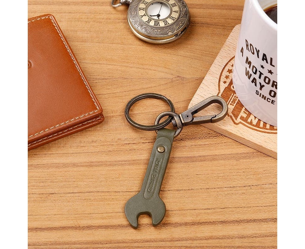 This leather keychain is inspired by the spanner tool and made for the ones who are fix-it-all-by-myself. With the iconic Royal Enfield logo debossed on it the keychain comes with a doghook.