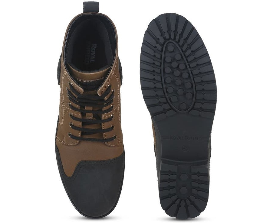 Royal Enfield branding at the shoe tongue and MLG branding at the ankle.