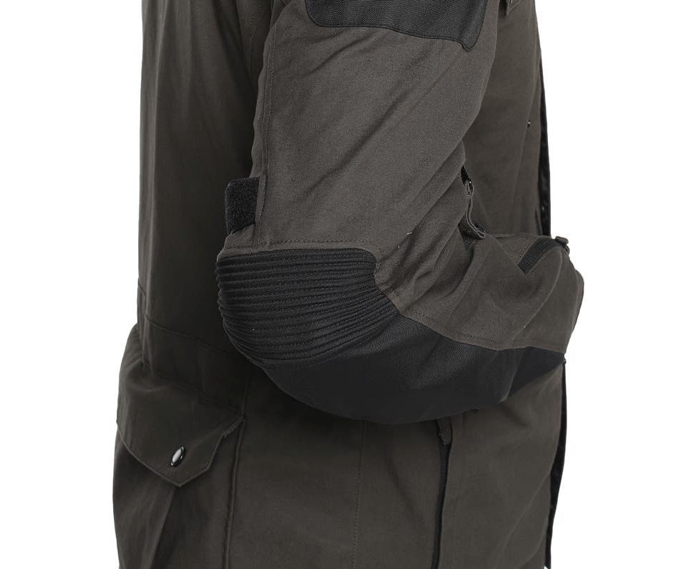 Fit: Tour fit. Regular. Adjustment tabs on cuffs, waist, biceps, forearms, elbows, and collar