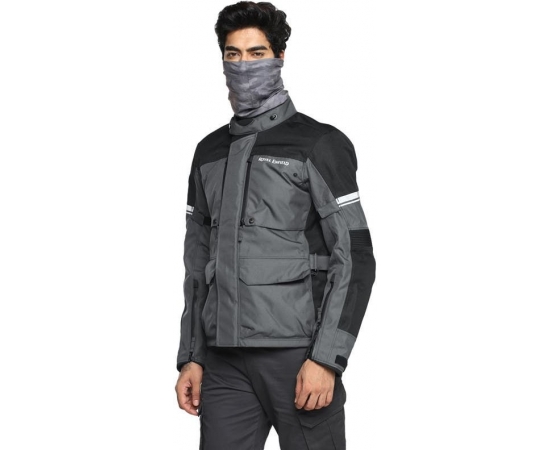 A blend of safety, comfort & convenience, the Royal Enfield Stormraider CE certified riding jacket is built with superior abrasion-resistant Polyester fabric with double PU coating and sealed seams making it highly-resistant to rain-showers. The jacket comes equipped with D3O EVO X CE Level 1 Flex armours at shoulders and elbow, which are ergonomically designed to adapt to the size of the user. The entire jacket as a unit is CE certified. A single layer combining resistance to abrasion and the rains make this jacket lighter & versatile for various kinds of rides. Neoprene fabric at the chin and cuff prevents chafing. Three large secure pockets provide enough space for personal essentials and zippered vents with mesh allow for better air-flow management, whether on a ride around town or exploring a new trail.